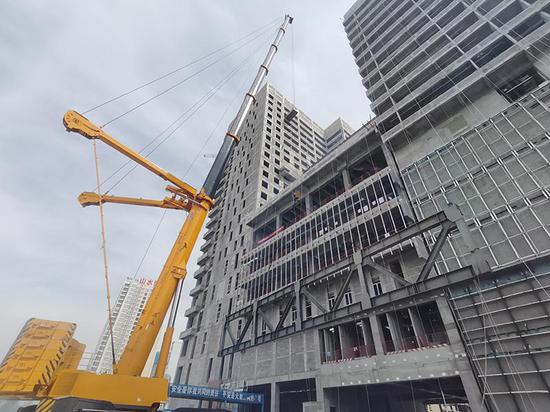 尤其是在项目抢交工阶段,需要完成两主楼之间跨度32.8米,距地面59.4米,总重量161.81吨的钢连廊吊装,工程将主桁架在地面组装后整体吊至空中安装固定,后续横梁构件均在空中焊接安装,作业难度极高、安全措施非常关键,支部书记带领团队提前交底,多次修改技术方案,历经7天完成了最后一道重难点工序。