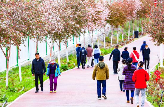 中新网新疆新闻5月8日电 “五一”假期首日,乌鲁木齐高新区(新市区)鲤鱼山公园里的海棠长廊就以全新面貌迎接市民和游客。
