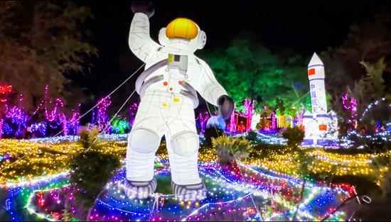 循着五颜六色的灯光前行,一路上,两侧草坪被大片灯光覆盖,向远处不断延伸,再搭配上大小不一的圆形发光造型灯和“航天员”“月球”“卡通动物”等气模,让人瞬间犹如置身璀璨的星河。