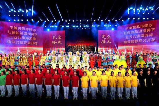 “光荣塔大,光荣塔大,不断壮大,使命重大;光荣塔大,光荣塔大,发扬光大,志向远大……”全场起立高唱校歌《光荣塔大》,庆祝塔里木大学建校65周年文艺演出落下帷幕。