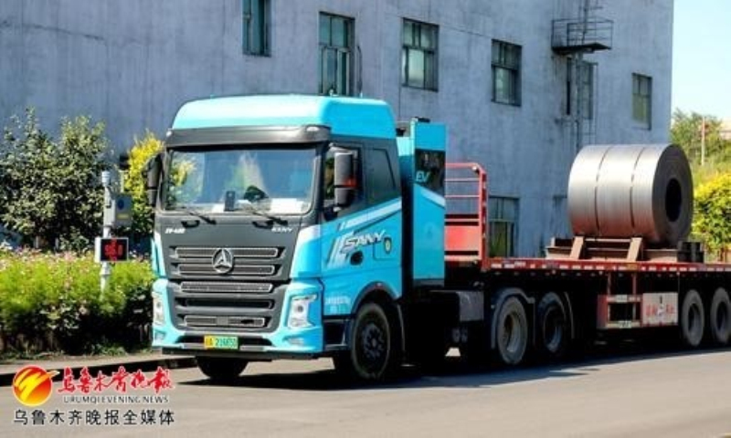行走在八钢公司厂区,不时可见一辆辆新能源电动重卡拉载着热卷、冷卷、板材等产品外出。