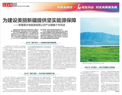 中新网新疆新闻5月11日电(杨洋)5月10日是“中国品牌日”。新疆粤水电能源有限公司(下简称为新疆粤水电)刊发《为建设美丽新疆提供坚实能源保障——新疆粤水电能源有限公司产业援疆十年综述》署名文章,介绍广东省属企业援疆十年,服务国家战略,提供坚实能源保障,奋力开创援疆工作新局面的出色答卷。