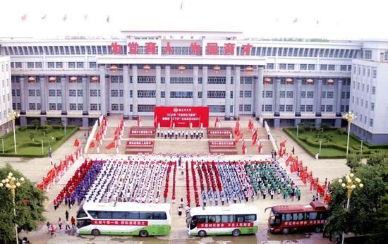 7月6日上午,伴随着雄壮的奏唱国歌声,塔里木大学2024年“万名师生下基层”暨暑期“三下乡”社会实践出征仪式在综合楼前举行。