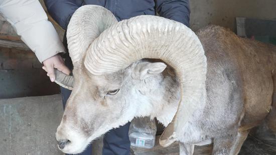 盘羊俗称大头羊、大角羊、盘角羊,体色一般为褐灰色或污灰色,在国际上已被列入禁运动物的名单,受到严格的保护,属于濒临灭绝的珍稀保护动物。此次被救助的盘羊躯体肥壮,体长145厘米,肩高105厘米,体重200千克左右。