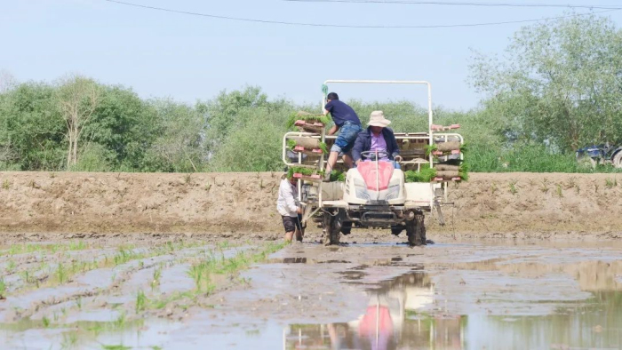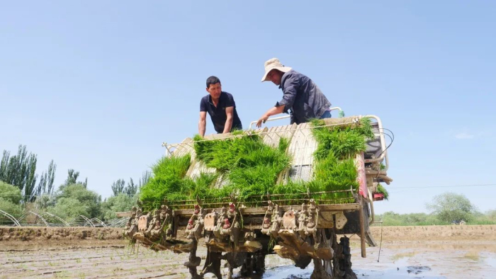 驾驶员正操作插秧机将嫩绿秧苗精准植入浅水区。祖力皮卡尔·吐尔地 摄