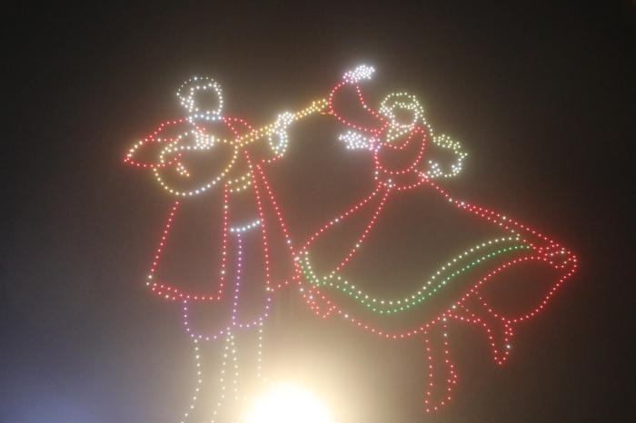 当夜幕降临,音乐节迎来了又一高潮。数千架无人机腾空而起,在沙漠的夜空中变幻出民族乐器、石榴、艾德莱斯绸、舞蹈等极具新疆特色的图案。这场科技与艺术完美结合的空中芭蕾,与地面舞台的绚烂灯光、动感音乐交相辉映,构成了一幅震撼心灵的画面,引来观众阵阵惊叹,纷纷举起手机记录下这难忘瞬间。无人机表演的余韵未了,场地中央的巨型篝火被瞬间点燃,跃动的火焰映照着人们欢快的笑脸,将现场气氛推向另一个高潮。在热情奔放的民族音乐伴奏下,素不相识的游客们手拉着手,围绕着熊熊篝火载歌载舞,形成一个个欢乐的圆圈。