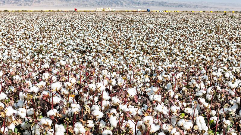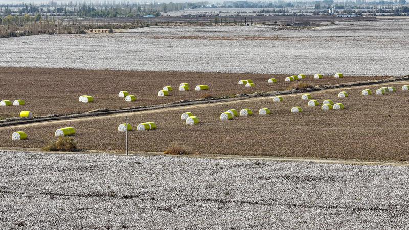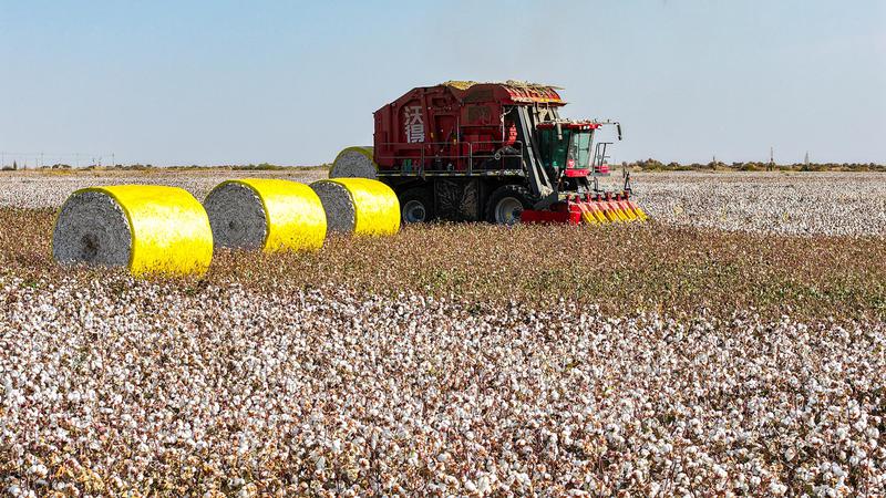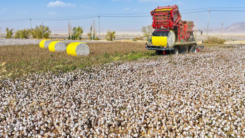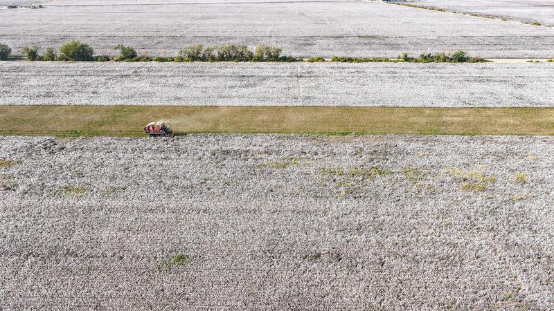 新疆托克逊县万亩棉田迎丰收 智慧农机穿梭“白色海洋”