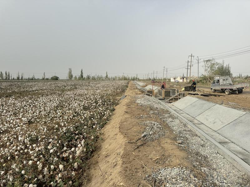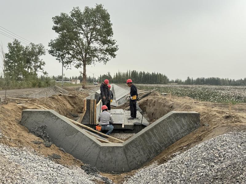 10月8日,记者在巴楚县英吾斯塘乡再库勒村项目施工现场看到,工人们正熟练地进行建筑物搭建等作业。这条承载着希望的防渗渠,即将在广袤的农田间蜿蜒穿梭。