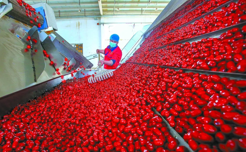 产业的丰收从来不止于田垄间的硕果,更在于产业链条的“节节攀升”与价值的“层层叠加”。近年来,麦盖提县以打造“全疆优质有机红枣产业基地”为目标,走出了一条从“卖原料”到“创品牌、深加工”的高质量发展之路,不仅成功引进39家农副产品精深加工企业,构建起从初级分拣到高端制造的产业矩阵,更持续深挖红枣价值,在产业链延伸上不断突破。如今,麦盖提县的红枣早已跳出“新鲜果实”的单一形态,变身成为丰富多样的红枣酒、红枣醋、红枣酵素、红枣饮料等特色产品,这些经过精细研发的深加工产品,不仅让红枣的附加值实现数倍提升,更构建起“红枣种植—加工生产—废料利用”的生态链循环,真正实现“一颗红枣浑身是宝”,让资源利用率最大化。