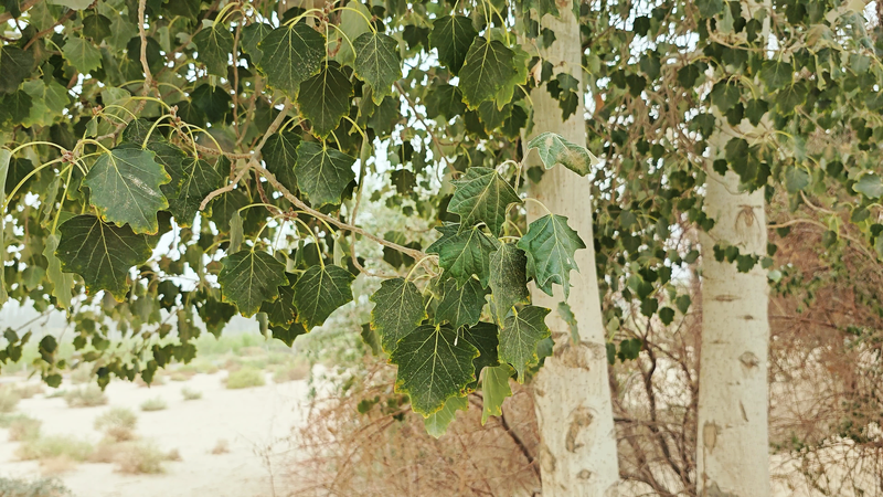 新疆杨又称新疆白杨,属杨柳科杨属,是典型的温带干旱区乔木。其形态结构与生理特性高度适应极端环境,叶片表面密被白色绒毛,可有效反射强光、降低叶片温度,从而减少水分蒸腾;根系极为发达,主根深扎可达地下10米以上,侧根水平伸展范围广,形成密集的根网,既能吸收深层土壤水分和养分,又能有效固持沙土,增强土壤抗蚀能力。此外,新疆杨还具备较强的耐盐碱与耐贫瘠能力,能在其他树种难以存活的恶劣立地条件下正常生长。
