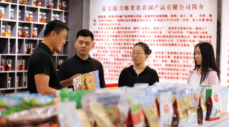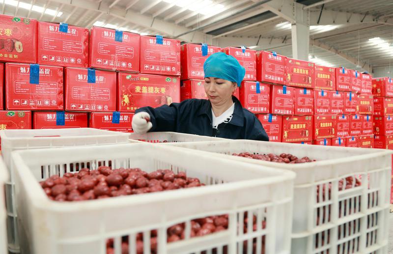 从种植到加工,麦盖提的红枣产业链也越来越完善。全县引进了39家农副产品加工企业,建成43条生产线,不管是初加工的红枣干,还是精深加工的红枣酒、红枣醋,都能在县里完成。“以前红枣摘下来,得拉到外地去加工,费时又费钱。现在家门口就有加工厂,红枣送过去,几天就能变成包装精美的产品,特别方便!”麦盖提县希依提墩乡月塘村村民艾尼瓦尔·热合曼笑着说。如今,麦盖提县广大枣农90%以上的红枣都能在县里完成初加工,20%以上能做成深加工产品,红枣的“身价”也跟着涨了不少。