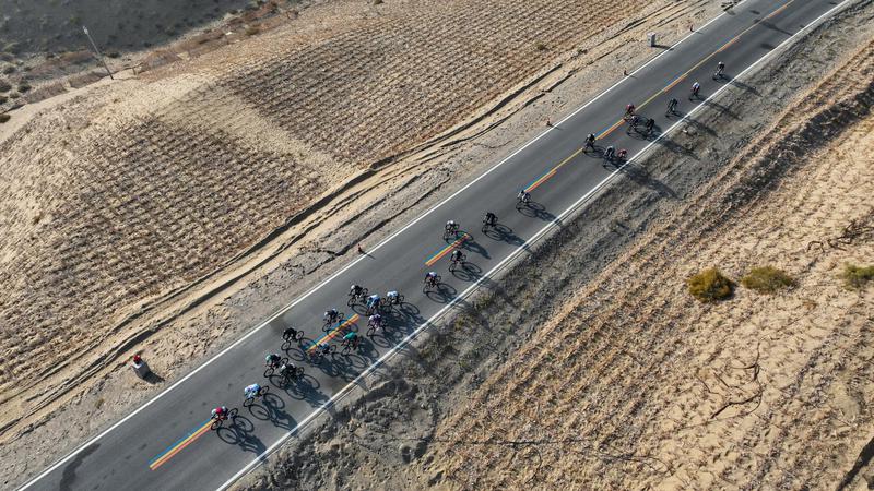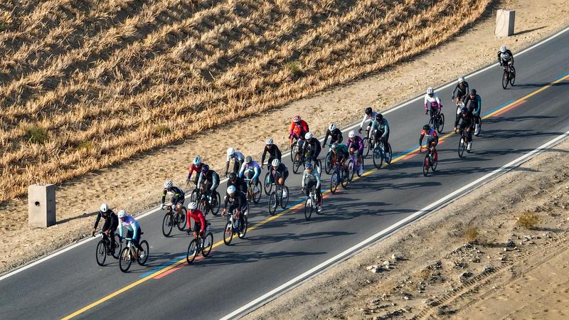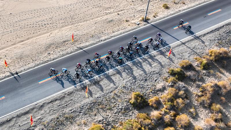 比赛当日,天高云淡,博斯腾湖水碧波荡漾,与远处的沙漠、金黄的芦苇构成一幅绝美的生态画卷。身着各色骑行服的选手们如离弦之箭,在这幅“一半湖水,一半沙漠”的壮丽画卷中奋力角逐,将独特景致尽收眼底。