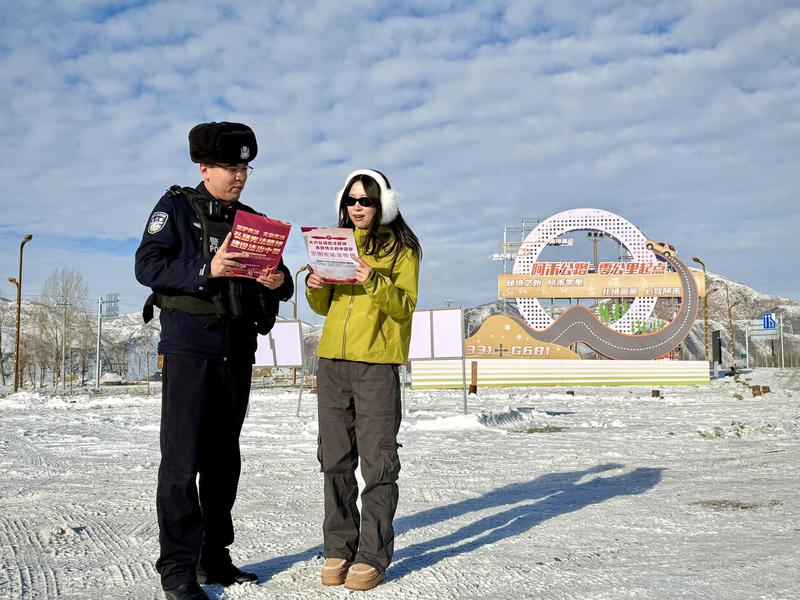冬日的G618阿禾公路,银装素裹的山峦与蜿蜒的公路相映成景,这条被誉为“北疆最美自驾公路”的交通要道上,不仅有雪山林海的壮阔风光,更有一抹“藏蓝”为旅途保驾护航。在第十二个国家宪法日到来之际,阿勒泰边境管理支队拉斯特边境派出所的民辅警们化身“法治宣传员”,在这条串联起阿勒泰市与禾木村的黄金旅游线上,开展了一场“接地气、暖人心”的宪法宣传活动,让法治精神与边疆美景相融共生。