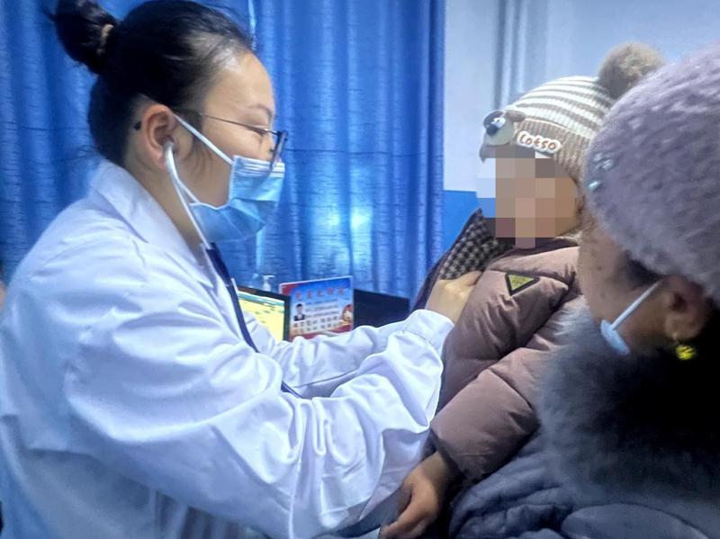 12月2日晚,在萨罕镇卫生院的夜间儿科门诊室里,医生正为一名发热患儿测量体温、听诊检查,自夜间门诊开通以来,每晚都有患者前来就诊。