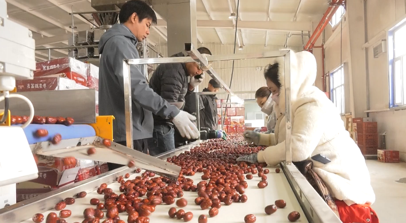 在麦盖提县宏伟果蔬枣业有限公司的生产厂房内,流水线机器高速运转,红枣清洗作业有序推进。工人们分工协作、默契配合,将洗净的红枣依次完成晾干、分拣、装箱等工序,整个流程行云流水,呈现出一派火热的生产景象。