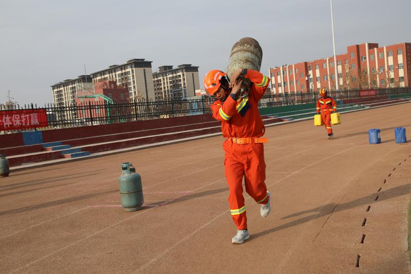 而在400米疏散物资竞赛科目现场,参赛队员比的不仅是速度,更比的是韧劲。参赛人员在400米的赛程里需要疏散三种物体:120斤重的假人、两个32斤重的泡沫桶以及30斤的液化气瓶。拼尽全力、咬紧牙关,激烈角逐,用实际行动彰显坚韧意志。