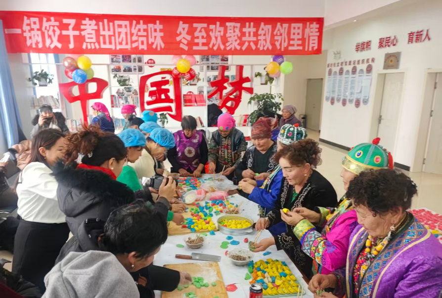 演出结束后,包饺子、趣味游戏等互动环节热闹开启。各族群众围在一起,擀皮、包馅、吃饺子、话家常,一个个饱满的饺子盛满团结情,游戏场上不分你我、欢声笑语不断,拉近了邻里距离,凝聚了奋进力量。