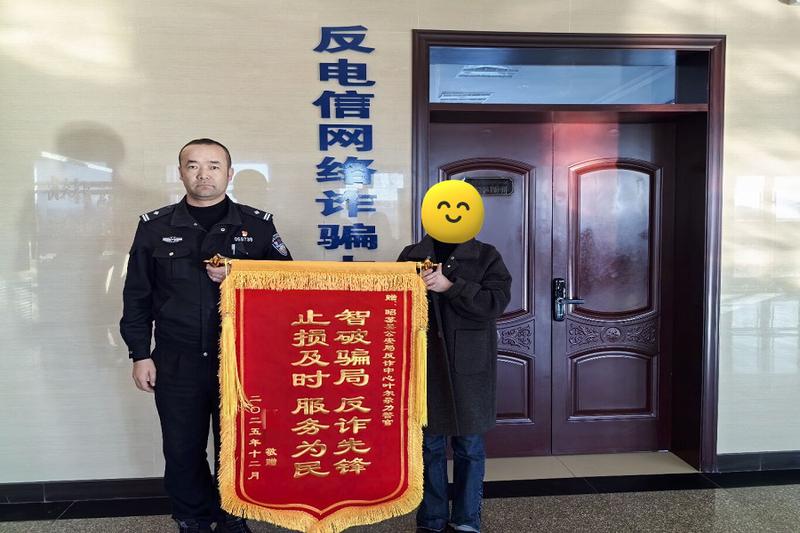 2025年12月25日,昭苏县反诈中心上演暖心一幕。 辖区居民李女士将一面印有“智破骗局反诈先锋,止损及时服务为民”字样的锦旗送到反诈中心民警手中,以此表达对民警成功追回其被骗8.5万元的感激之情。