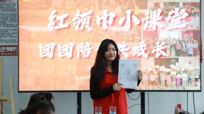 返乡大学生志愿者在“红领巾小课堂”给学生上课。高依然