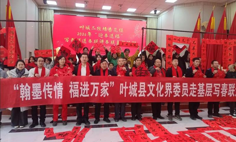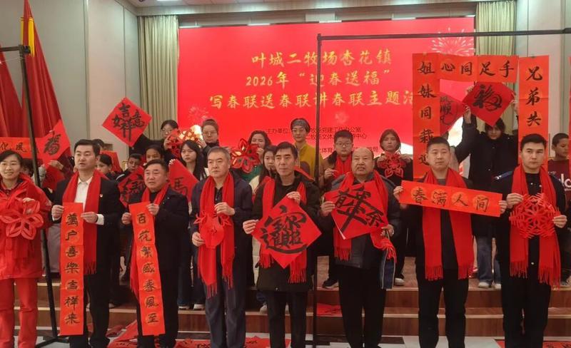 在金蛇辞岁、骏马迎春的新春佳节来临之际,为大力弘扬中华优秀传统文化,丰富叶城二牧场职工群众的精神文化生活,营造喜庆祥和的节日氛围,2月2日,叶城县文化馆、图书馆、书法协会一行赴叶城二牧场杏花镇开展“迎春送福”写春联、送福字、讲春联主题活动。此次活动参与人次达200余人,现场书写春联150副、送出福字150副。