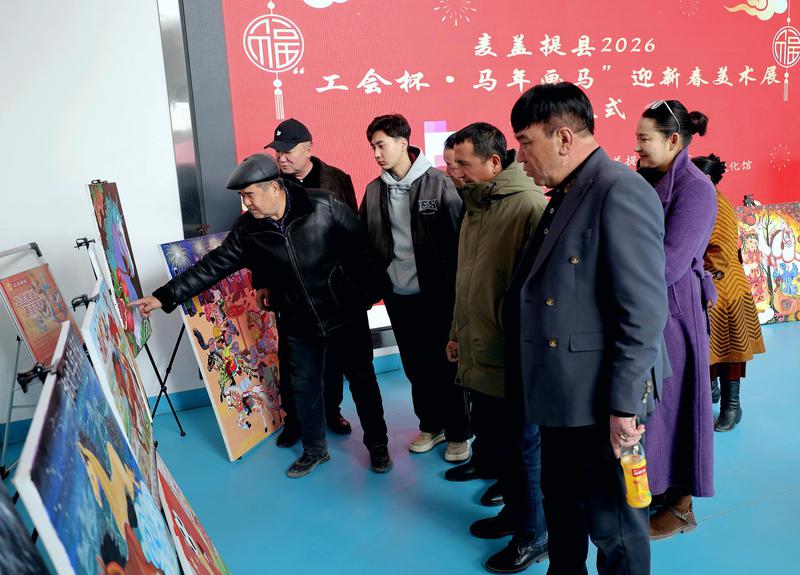 2月13日,麦盖提县2026“工会杯·马年画马”迎新春美术展在该县新时代文明实践中心开展。数十名农民画家、美术爱好者和干部群众参加启幕仪式。