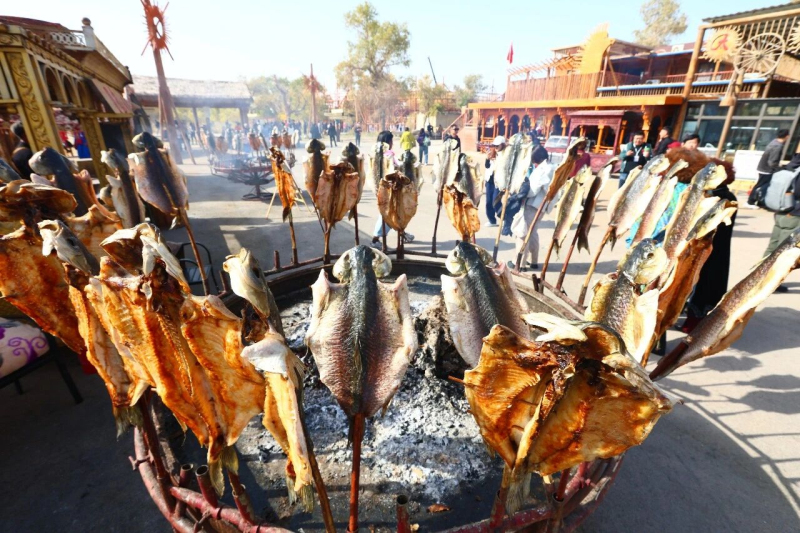 以阿不旦广场为起点的罗布商道,串联起若干家以装配式建筑、木质结构为特色的摊位市集,让游客穿越丝路烟火,体验千年前民族团结一家亲,古丝绸之路上的繁华盛景。在射箭台,商户现场指导站姿、握弓技巧,在拉弦射箭之间体验传统射艺的乐趣;在文创产品摊位前,极具辨识度的小花帽特色罗布羊、民族特色少女玩偶、艾德莱斯款式的小马、挂件等伴手礼物,让游客更深入了解罗布人民俗文化,丰富旅游历程;在美食摊位前,香气四溢,罗布烤鱼、红柳烤肉等特色美食,满足游客的味蕾;在“尉犁礼物”摊位前,罗布麻茶蜜等产品,让游客“乐购”其中满载而归。