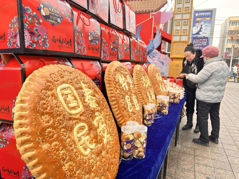 连日来,特纳格尔年俗大集好物荟萃、暖意融融。刻有“国泰民安”“物阜民康”字样的巨型“阿魏草锅盔”,麦香裹挟着药香,以地道风味赢得群众青睐;承载西王母传说、被誉为“瑶池甘露”的“御见瑶池”酒,凭借独特文化底蕴与醇厚口感供不应求。两款九运街镇本土特色农产品双双走俏,成为新春年货节上的亮眼景致。