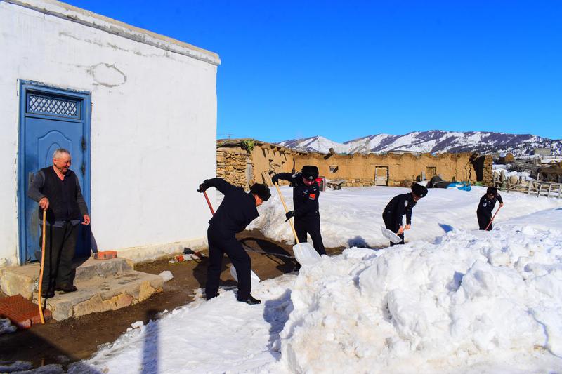 “剩下的交给我们!”民警们扛起铁锹、推起雪铲,踩着没膝的积雪,走进独居老人家中。民警们弯腰铲雪、推雪、扫雪,铁锹与冰雪碰撞的声音,在寂静的山村格外响亮。两个多小时后,院子清出一条小路,从门口延伸到房前。