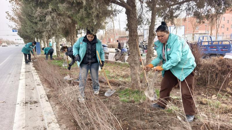 3月17日,记者在巴楚县迎宾路绿化补植现场看到,园林工人们分工协作、配合默契。有的挥动铁锹铲土挖坑,有的扶正树苗校准位置,大家严格按照绿化种植规范操作,对每一个环节都精益求精,全力保障苗木的成活率。