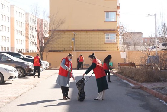 博格达尔路社区志愿者打扫辖区环境卫生。温泉县融媒体中心记者赵星 摄