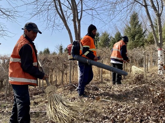 3月30日,在博乐市小营盘镇当合尔特布拉格村,各族干部群众一同拔除杂草、为树木涂白。