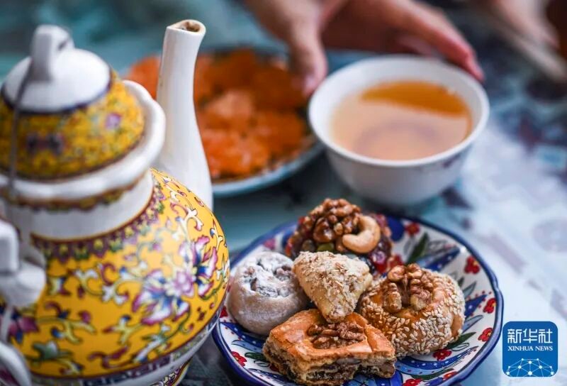 在喀什古城百年老茶馆内,茶客在品尝特色茶饮和茶点。来源:新华社