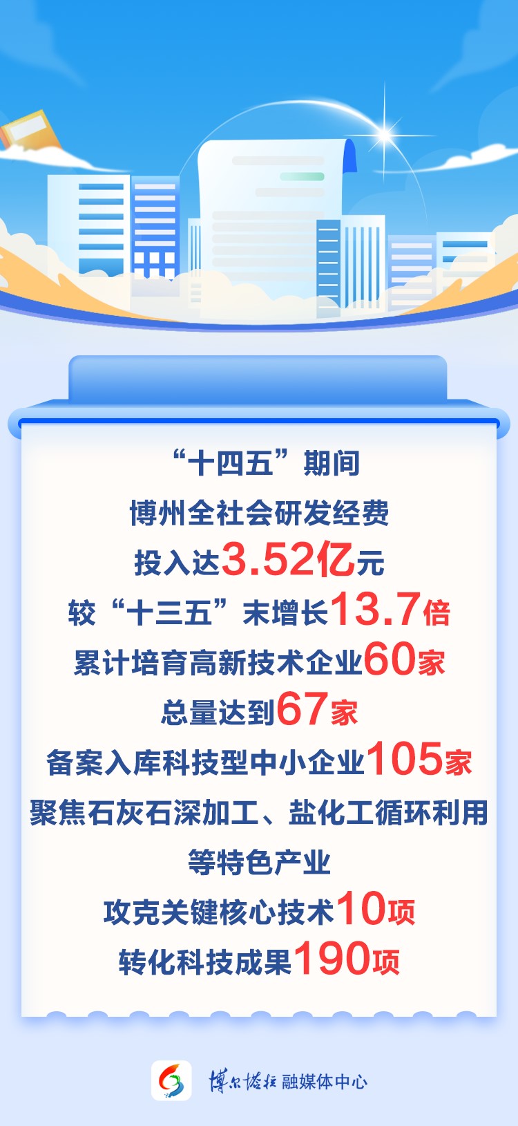 五年来,博州紧扣高质量发展首要任务,以创新主体培育为抓手,“十四五”期间累计培育高新技术企业60家,截至目前总量达到67家。备案入库科技型中小企业105家;聚焦石灰石深加工、盐化工循环利用等特色产业,攻克关键核心技术10项,转化科技成果190项,创新链与产业链深度融合的“乘数效应”持续释放。