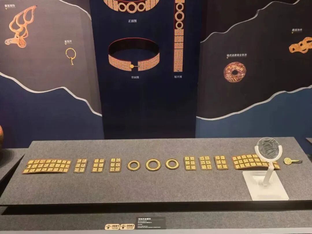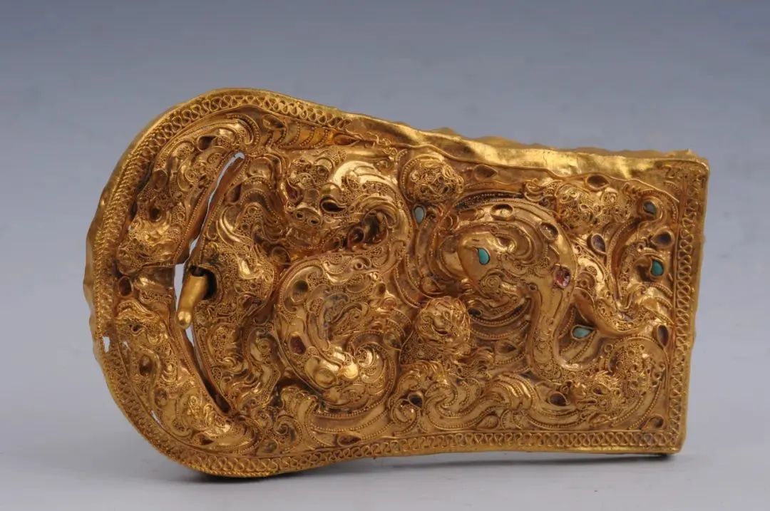 腰带整体展示出比较复杂的工艺技术,大体是用铁制网格和薄铁板把事先加工好的压印有花纹的金板夹住,通过网格显露出金板的花纹。这样大小不一的金牌饰有八块,以及圆环形金牌饰三块,加上包金带钩,组成了金腰带的主体,背衬原应衬以皮带,整体精美大气。是研究亚欧草原早期牧业文明的葬俗葬制的重要历史实物。