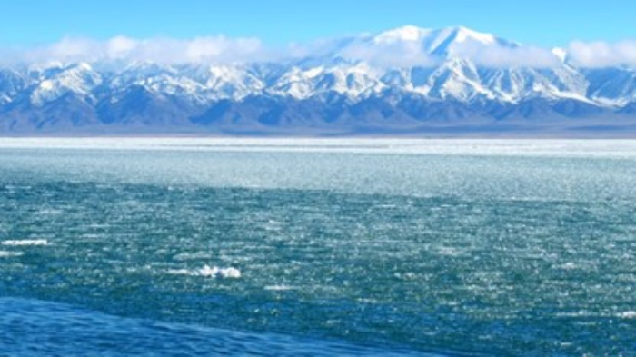 赛里木湖冰推期独有的“半湖脂玉半湖蓝”景观。