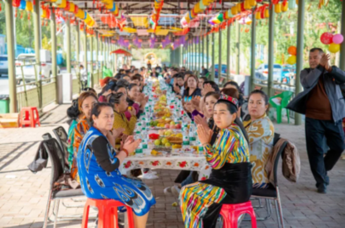 精河县阿合其农场农三队各族群众在石榴巷一起过中秋节。来源:精河零距离