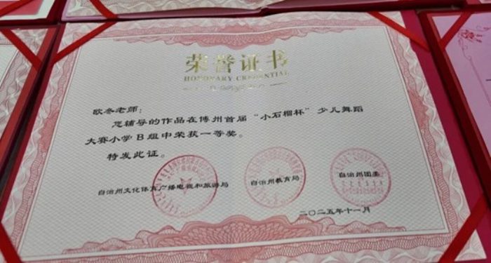 2025年11月,欧冬与欧尔琴共同编排的舞蹈《心声》,斩获博州首届“小石榴杯”少儿舞蹈大赛小学组一等奖。