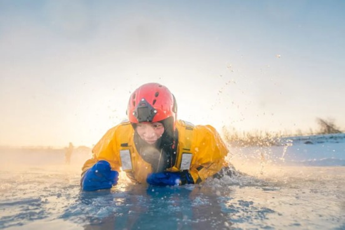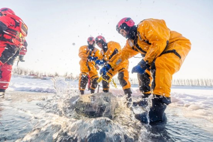 培训现场,呵气成霜,寒风刺骨,对参训人员的体能、技术和意志都是严峻考验。教练员和领队员们,采取“理论讲解、示范操作、科目实操、达标考核”相结合的集训模式,从救援理论,到个人防护装备穿戴、冰面探测、抛投救援等实操技能演练,层层展开,全力锤炼队伍实战能力。