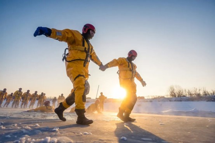 在接近-30℃的极寒天气下,28名消防指战员顶风冒雪,在冰面上展开高强度训练,着力提升队伍在严寒条件下的专业救援能力。