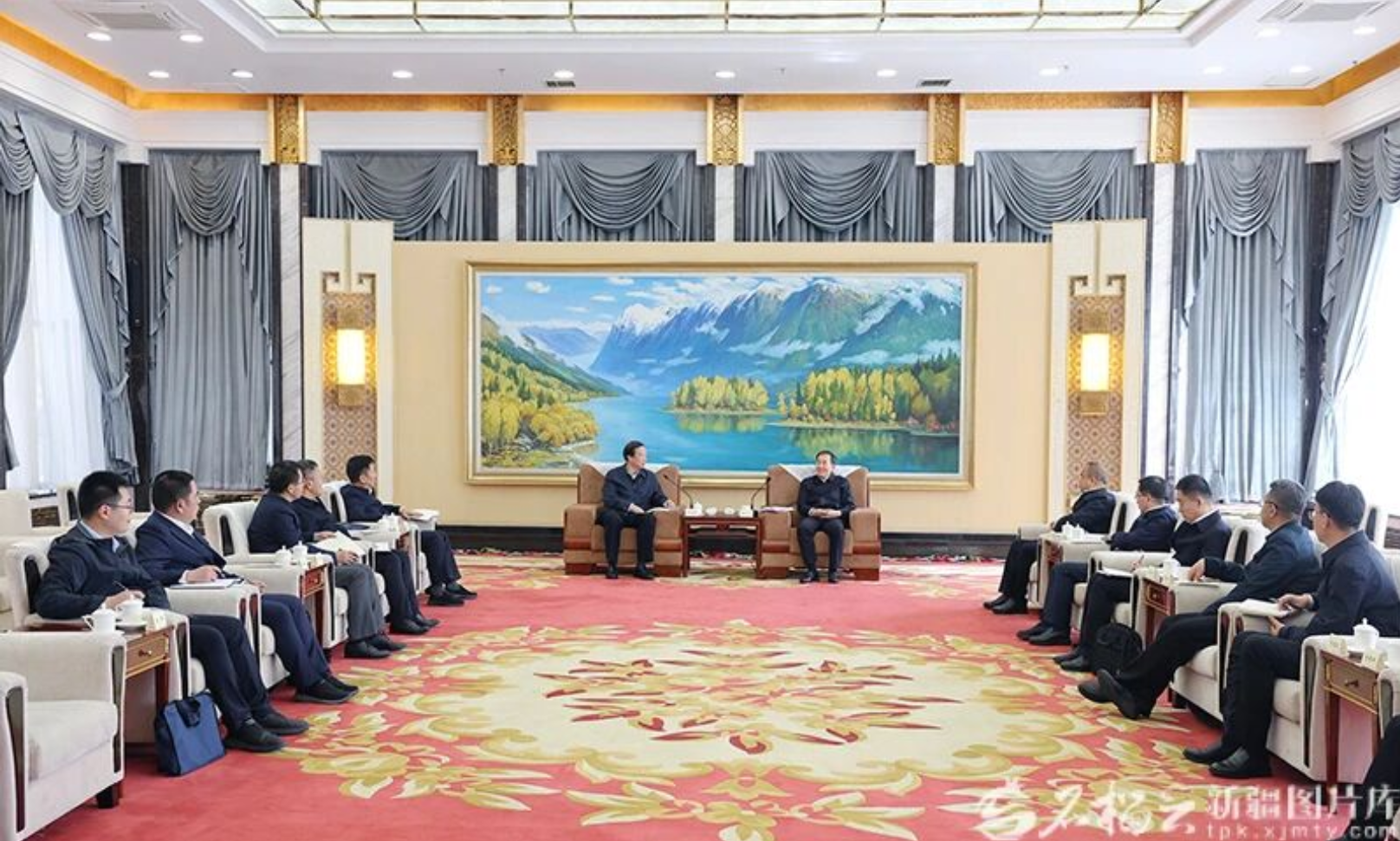 10月16日,自治区党委书记陈小江、自治区主席艾尔肯·吐尼亚孜在乌鲁木齐会见工业和信息化部党组成员,国家烟草专卖局党组书记、局长张建民一行。石榴云/新疆日报记者 谢龙摄