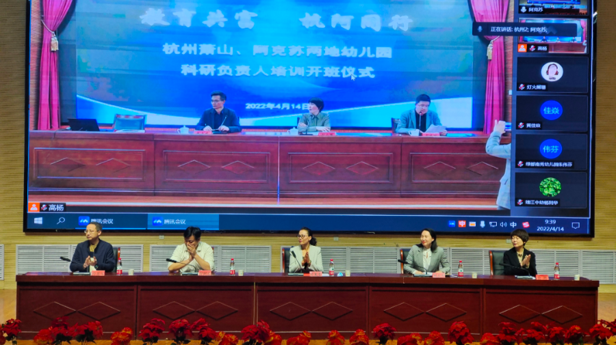 中新网新疆新闻4月18日电(冯勇)4月14日,杭州市萧山区和阿克苏市在线上举行了一场别开生面的开班仪式。为进一步加强教育对口支援,充分利用信息技术拓展合作交流的渠道,实现优质教育资源共享,在杭州市援疆指挥部和阿克苏市教科局的大力支持下,杭州市萧山区教师发展学院和杭州市援疆教师团共同组建了两地幼儿园科研负责人培训共同体。阿克苏市155位幼儿园园长和保教主任,杭州市萧山区60位幼儿园科研负责人将通过钉钉连群直播开展教科研同研共训。