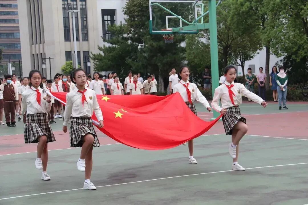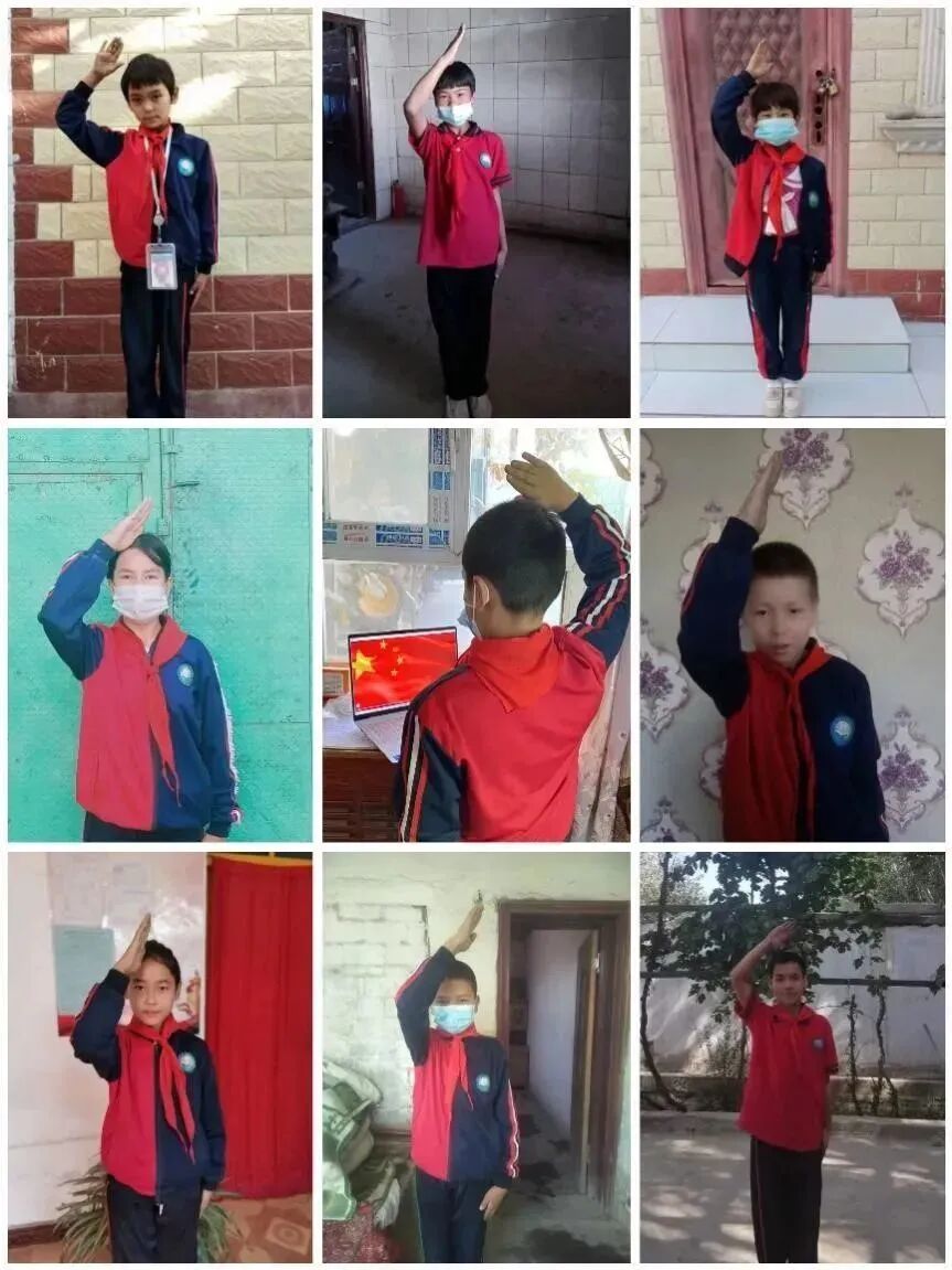 两校共同举行升旗仪式。伴随着雄壮的国歌,面对着冉冉升起的五星红旗,全体少先队员庄严肃立。由于疫情,库木巴什乡小学的少先队员们在家中完成了一场别样而隆重的升旗仪式。虽隔着千山万水,但在此时,一颗颗拳拳赤子之心在云端相连。
