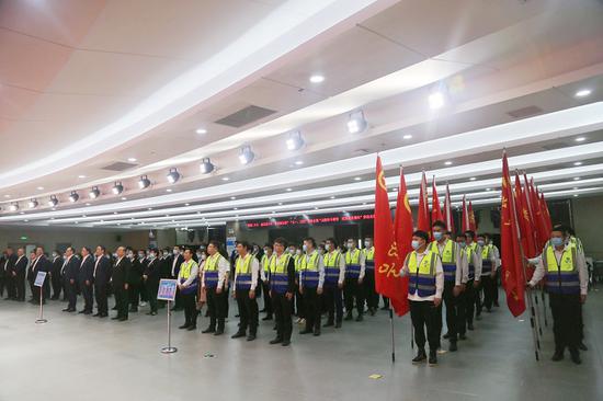 随后,陈刚带领全体党员重温入党誓词,并为党员先锋号、工人先锋号、青年文明号、党员突击队、青年突击队授旗。活动最后宣读了“点燃奋斗激情 实现完美履约”劳动竞赛誓师大会倡议书,聚焦启动劳动竞赛、三号联创、党、工、团突击队,找准党建融入生产经营的发力点,进行誓师、动员,围绕中心、服务大局,在全公司范围内掀起各项目大干快上的热潮。