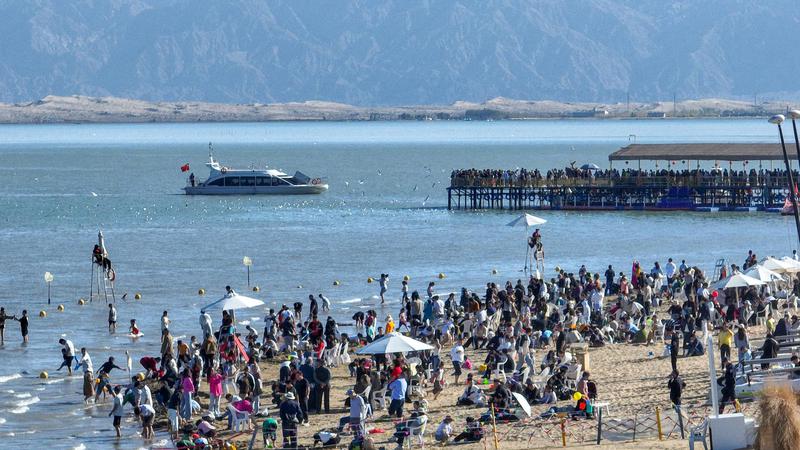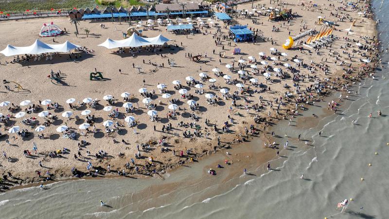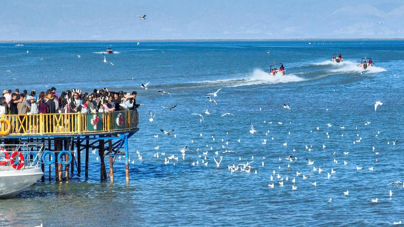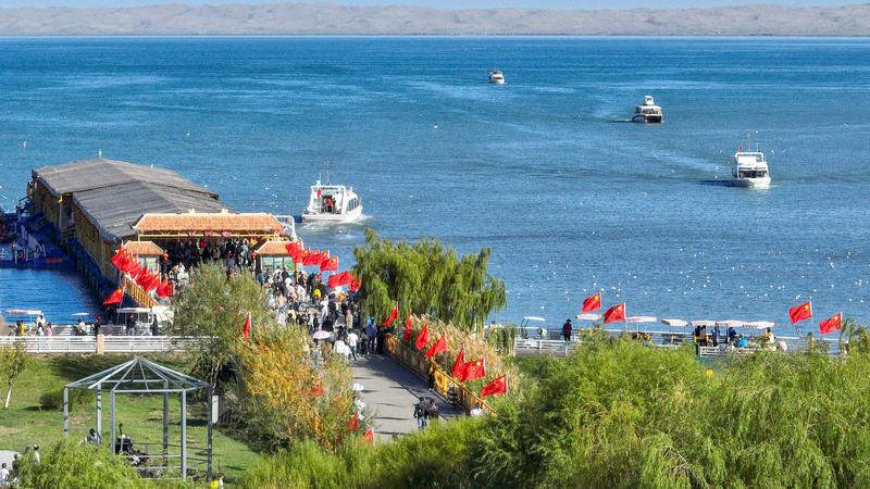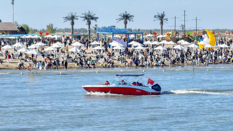 随着“十一”长假的来临,新疆博斯腾湖景区迎来了又一个旅游高峰期。2025年10月4日,在新疆维吾尔自治区巴音郭楞蒙古自治州博湖县境内的博斯腾湖大河口景区,节日氛围与旅游热潮同步升温,游客们悠闲漫步细软沙滩,或乘快艇破浪疾驰,体验速度激情;水上飞人惊险炫技引来阵阵喝彩;更有游客在清澈湖水中畅游嬉戏,享受秋日暖阳。远处沙山连绵,近处碧波万顷,绘就“一半沙漠一半湖泊”的壮美画卷。今年国庆与中秋双节叠加,博湖县以“文旅+生态”“文旅+民俗”为抓手,推出系列文化活动,吸引各地游客纷至沓来,尽情领略“瀚海明珠”的独特魅力。(年磊)