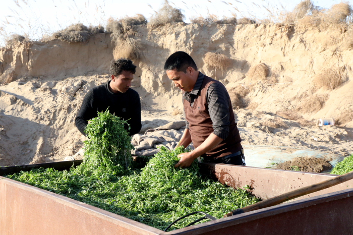 努尔艾合麦提·艾麦提在阿其克村承包了250亩苜蓿,如今已是第三年采收。每年采收季,附近村的村民都会来这里帮忙。吐尔孙·卡迪尔正是采收工中的一员,他一边清洗苜蓿,一边向记者分享,这几年苜蓿种得越来越多,每年采收季都需要不少工人,他们都愿意来这儿干活。