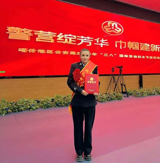 3月6日,在喀什地区公安局“三八”国际妇女节座谈表彰会上,姑丽克孜作为成绩突出女辅警代表,身着笔挺制服,走上发言席。她分享了自己十年来的点滴感悟,没有豪言壮语,只有平凡岗位上的真实故事和朴素心声。她说:“我越来越懂得,公安工作很少有惊天动地的瞬间,更多的是日复一日的琐碎与坚持。群众的每一件‘小事’,都是我们心头的‘大事’。把温暖送给需要的人,把隐患挡在发生前,这就是我的价值。”