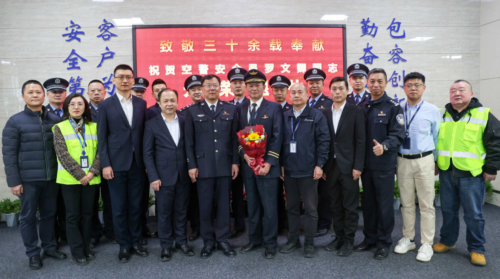 航班落地后,民航新疆管理局公安局局长靳杰,南航新疆分公司副总经理曹葵专程等候在空勤服务中心,为罗文卿举办温馨庄重的退休仪式,并为罗文卿送上鲜花与诚挚祝福,充分肯定他扎根空防一线的突出贡献,祝愿他退休生活幸福安康,同时寄语下一代年轻空警安全员传承前辈优良作风,扛起空防重任、不辱神圣使命、奋勇砥砺前行,以实际行动守护民航平安。