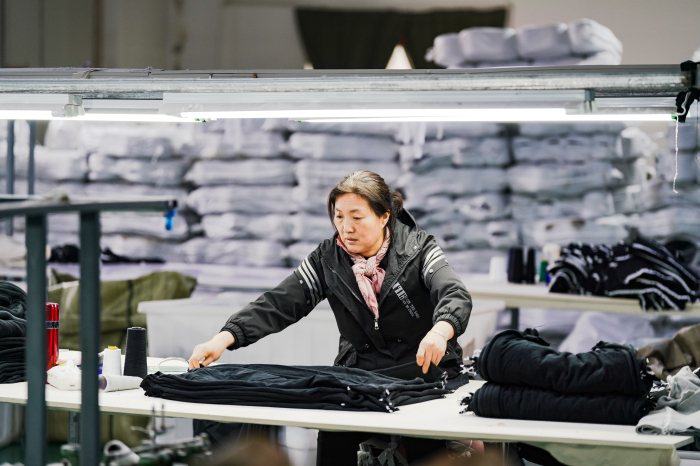 3月10日,新疆卡鑫隆服饰织造有限公司生产车间,工人正在工位上对生产的成衣进行检验。 常谊谊 摄