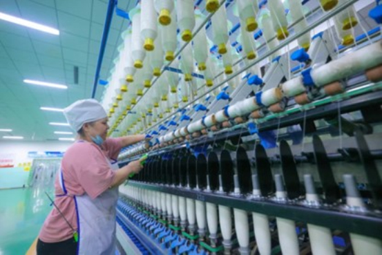新疆金鑫昱纺织有限责任公司纺织设备高速运转,工人有序作业(资料图)。来源:博尔塔拉融媒体中心图库