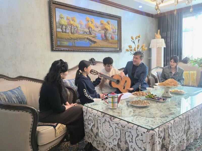依木然为家人弹奏吉他。靳蒙蒙 摄